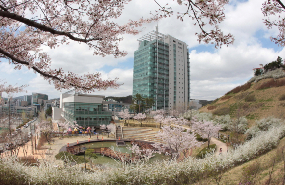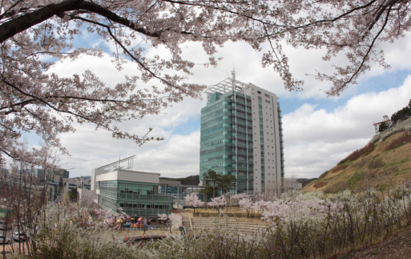 포항시청 연못 주변에 만개한 벚꽃이 청사와 함께 어우러져 장관을 연출 하고 있다.
