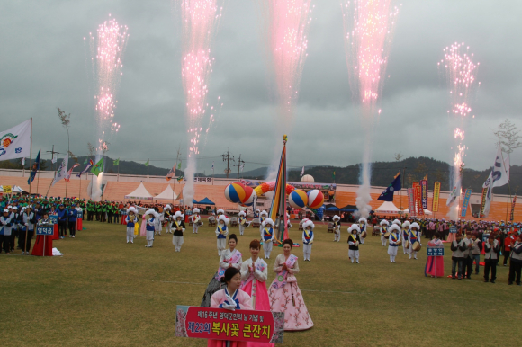 |  | | | ⓒ GBN 경북방송 | | 대항전을 펼칠 관내 9개 읍․면의 특색과 개성을 드러낸 입장식과 함께 궁중무용 무고 공연인 ‘복숭아 진상 퍼포먼스’가 ‘상생의 염원’이란 주제로 공연돼 흥을 돋우고 이후 대게각시난타팀의 난타 대북공연과 경상북도 무형문화제 제36호인 영덕월월이청청 공연으로 이어진다.
