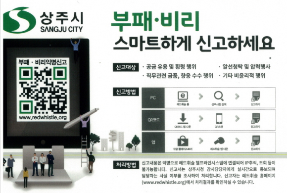 신고방법은 상주시 홈페이지(www.sangju.go.kr)에 설치된 “익명신고 배너”를 클릭하여 신고할 수 있으며, 스마트폰의 경우 각 사무실 또는 공공장소에 비치된 익명신고 QR코드가 인쇄된 “클린명함” 혹은 “클린스티커”를 스캔하여 이용할 수 있다.