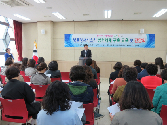 성주군 희망복지지원단은 4월 10일 성주군종합사회복지관에서 민·관 방문형서비스사업 관계자 50여명을 대상으로 방문형서비스사업 협력체계 구축을 위한 간담회 및 교육을 실시했다.