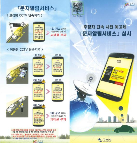 구미시(시장 남유진)는 지난 2013년 6월부터 전국 최초로 주·정차단속 사전문자알림제도(2회)를 시행하여, 시민들의 많은 호응 속에 올해 4월말 현재 5만 여명이 가입하여 서비스를 받고 있다.