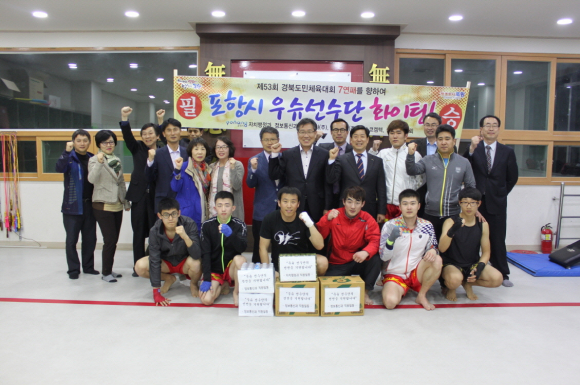 포항시 자치행정과는 15일 포우산업, 조선내화, 포스코캠텍 등 기업체 서포터즈 관계자, 장기면체육회, 정보통신과 직원들과 함께 도민체전 7연패 달성을 위해 구슬땀을 흘리고 있는 우슈 선수단 훈련장을 방문해 훈련에 필요한 물품과 음료수, 격려금 등을 전달하고 선수들의 선전을 기원했다. |