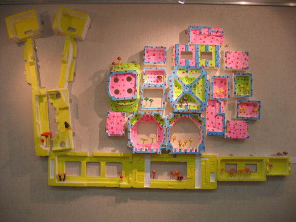 |  | | | ⓒ GBN 경북방송 | | 작가별 작품특징을 살펴보면, 신재순은 500년이 지나야 삭아 없어지는 스티로폼을 이용해 만든 작품으로 흥겨운 비보이의 춤을 표현하고, 윤상천은 커피포대에 그린 회화작업으로 지구 곳곳에서 비일비재하는 아동 노동착취에 대한 경각심을 일깨운다. 배현희는 파쇄지를 이용해 작품을 제작하고, 윤종호는 그리움을 상징하는 버선발, 고무신 등을 건축물 폐자재 등 육중한 재료로 표현한다. 김명삼은 버려진 다양한 물품들을 모아 전통 민화로 표현한다.