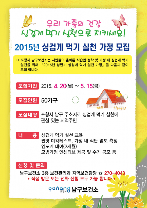 포항시 남구보건소는 ‘건강도시 포항 만들기’의 일환으로 ‘싱겁게 먹기 실천 가정’ 대상 가구를 이달 20일부터 5월 15일까지 모집한다.