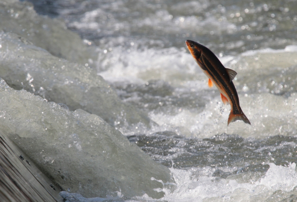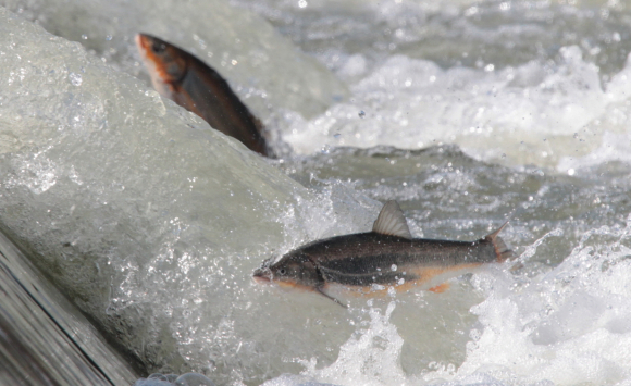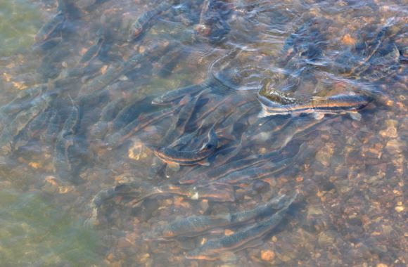 포항시 남구 연일읍 형산강변에 산란기를 맞은 황어가 힘차게 물살을 거슬러 올라가고 있다.