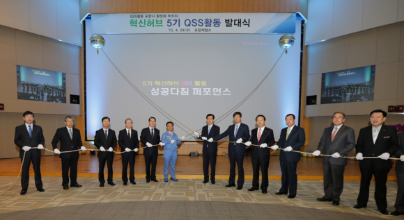 |  | | | ↑↑ QSS 혁신허브 5기 활동의 성공을 기원하는 퍼포먼스 (사진 좌측 5번째부터 우측으로 나주영 철강관리공단 이사장, 김학동 포항제철소장, 이강덕 포항시장, 윤광수 포항상공회의소 회장) | | ⓒ GBN 경북방송 | |