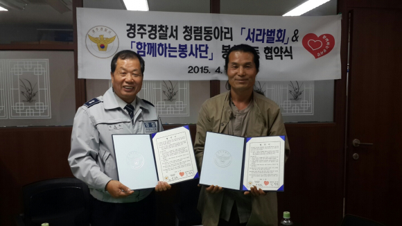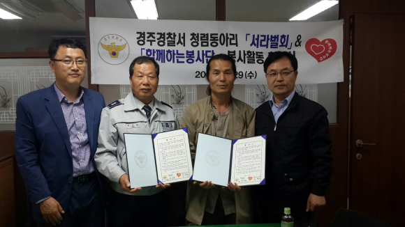 경주경찰서 청렴동아리 서라벌회는 29일(수) 경찰서 청문감사관실에서 민간 봉사단체인 『함께하는 봉사단(단장 김원주)』과 봉사활동 업무협약을 맺었다. 경주경찰서 청렴동아리 서라벌회(박종목 성건파출소장)는 경주경찰서 경찰관 및 일반직 직원 40여명으로 구성된 봉사활동 동아리로, 지난 2010년부터 소외계층 무료급식을 비롯해 장애인 및 기초수급자 가정 연탄배달 등 다양한 자체 봉사활동을 벌였다. 박종목 청렴동아리회장은, 이번 협약을 통해 소외계층 배려에 민관이 따로 없다는 공감대를 형성하고, 어려운 이웃에게는 좀 더 전문적이고 필요한 도움을 줄 수 있을 것으로 기대 된다고 말했다. 한편,『함께하는 봉사단』은 지난 2007년12월에 경주김씨 봉사단으로 출발한 순수 민간 봉사단체로, 20여명의 회원들은 전기, 설비 등 전문직과 일반 회사원 및 공무원으로 구성돼 있고, 매월 독거노인 등 저소득 가정 한곳을 선정해 주거환경 개선 사업을 하며 현재까지 80여가구에 도움을 주었다.