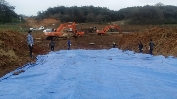 본 공사에는 타 현장에서 잘 볼 수 없는 40톤 험지덤프트럭과 대형포크레인을 투입하여 공정률을 증대시키고 있으며 전천후 작업이 가능하도록 비가 오는 날에는 작업로에 천막을 설치하여 다음날 작업에 지장이 없도록 대비하고 있으며 야간작업까지 병행하여 공사기간을 단축하고 있다.