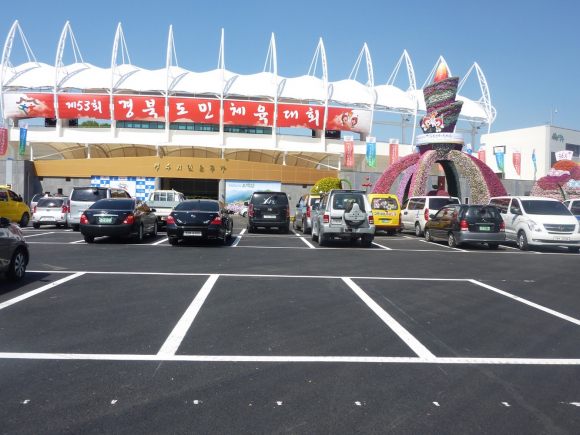 셋째, 체전기간 중 임시주차장은 총 9개소에 3,071대를 주차할 수 있도록 하였는데 국민체육센터 전정에 VIP용 30면(PV), 시민운동장 전정에 VIP용 120면(P1), 실내수영장 부지에 VIP용 250면(P2), P2주차장 맞은편 부지에 초청자용 330면(P3), 제2가흥교 밑 둔치에 초청자용 579면(P4), 경북전문대 운동장에 시군 선수단 버스용 147면(P5), P4주차장 아래쪽으로 일반인용 505면(P6), 가흥신도시 내 자원봉사자 및 종사원용 695면(P7), 경북전문대학교 안쪽에 일반인용 415면(P8)을 조성하게 되며, 5월6일까지 모든 주차장에 라인 설치를 완료할 계획으로 있으며, 체전기간 중에는 수시로 살수를 하여 먼지가 비산하지 않도록 하고, 각 주차장별로 공무원들을 전담 배치하여 주차안내에 최선을 다하기로 했다.