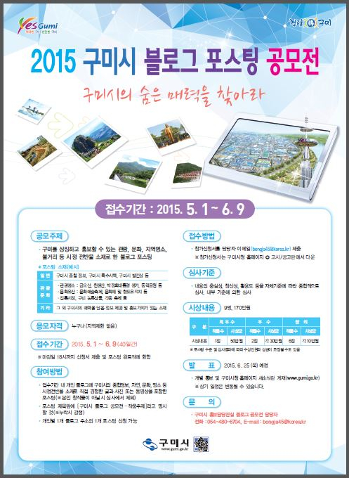 구미시(시장 남유진)는 5월 1일 부터 6월 9일 까지 구미를 상징하고 홍보할 수 있는 관광, 문화, 지역명소, 볼거리 등 시정전반을 소재로 한『구미시 블로그 포스팅 공모전』을 개최한다.