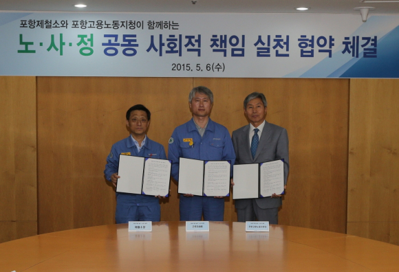 포스코 포항제철소(소장 김학동)가 고용노동부 포항고용노동지청과 6일 오후 포스코 본사에서 지역사회와 동반성장을 위한 ‘노사정(勞使政) 공동 사회적 책임 실천협약’을 체결했다.