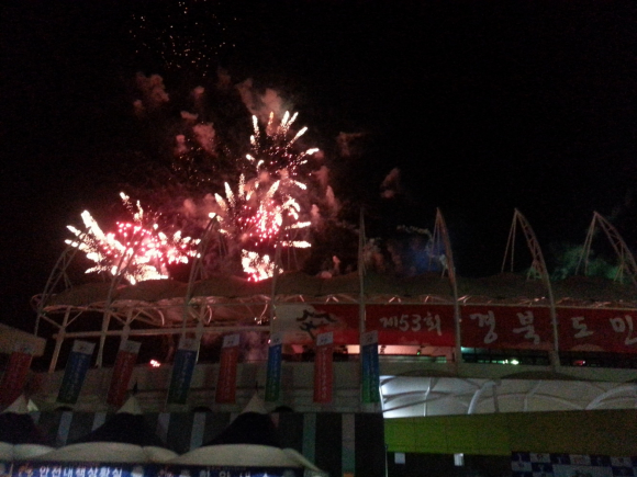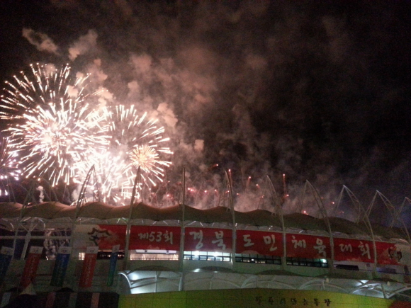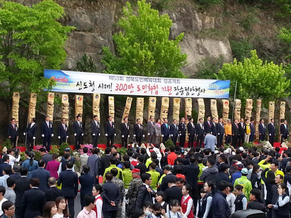 개회식에 앞서 경상북도, 도의회, 도교육청, 도경찰청, 도내 23개 시 군을 상징하는 장승 27개의 점안 퍼포먼스를 통해 경북도민의 안녕과 화합을 기원하였습니다. 그리고 독도사랑 태권도 시범단의‘우리땅 독도 퍼포먼스에 이은 선수단 입장에서 화약, 폭죽, 축포, 종이꽃가루 사용과 차량을 이용한 대형조형물 입장을 금지하여 안전사고 발생 우려를 해소했습니다. 김관용지사님은 대회사에서 “경북은 역사의 굽이마다 앞장서서 새로운 길을 열어왔습니다. 이제 경제혁신과 문화융성을 통한 사람 중심, 경북세상을 열기 위해 최선을 다하고 있습니다. (중략)도민의 행복, 경북의 영광, 조국의 미래를 몸으로 느끼고 확인할 수 있도록 하겠습니다. 오늘 우리 경북이 가는 길이 새로운 도약의 역사가 될 수 있도록 도민 여러분들의 관심과 배려를 부탁드립니다”라고 하셨습니다. 경주 토함산에서 채화된 성화와 소백산 연화봉에서 채화된 성화가 합화 되어 나흘 동안 영주지역에서 펼쳐질 열광과 영광의 순간을 훤히 밝히며 스포츠를 통해 경북이 하나가 될 것이라고 일깨워 주었습니다.