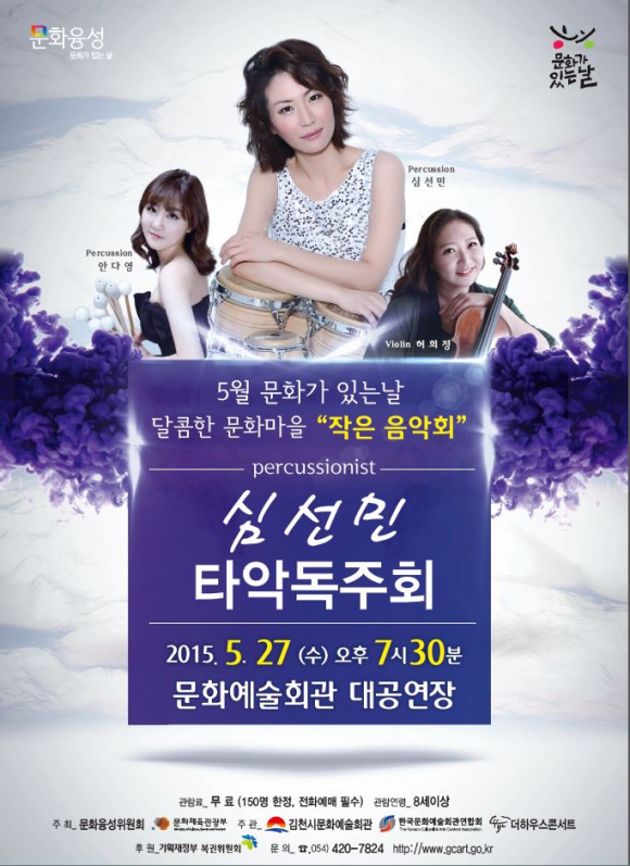 경쾌하고 감미로운 선율에 몸과 마음을 '힐링' 하게 할 이날 콘서트는 우리나라를 대표하는 중견 타악기 연주자인 퍼커셔니스트 심선민의 '타악 독주회'와 바이올린의 허희정, 퍼커션의 안다영이 함께 무대를 꾸밀 예정이다.
