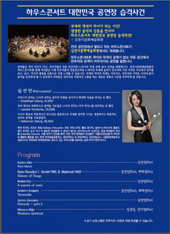 문화가 있는 날을 맞아, 관객과 연주자가 같은 공간에서 보고·듣고·악기의 떨림을 직접 느낄 수 있는 하우스콘서트 ‘심선민 타악독주회’가 김천시 문화예술회관 대공연장에서 개최된다.
