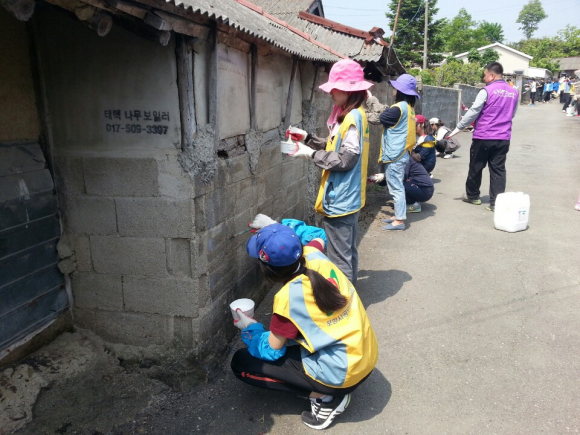 이날 봉사단은 ‘자원봉사 나무로 피어나다’를 주제로, 밝은 이미지의 색채를 사용해 산딸기, 야생화 등을 벽화 속에 그려 넣어 마을에 한층 생기를 불어 넣었다.