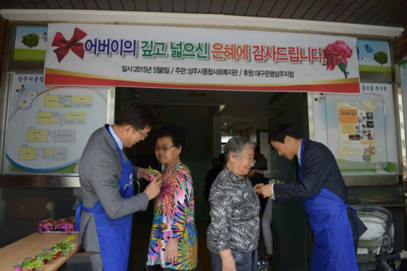 GB대구은행 상주지점 봉사단(지점장 배인규)은 지난 8일 어버이날을 맞아 상주시종합사회복지관에서 120여명의 지역 어르신들에게 카네이션을 달아 드리고, 떡과 과일등 음식을 푸짐하게 준비하여 경로잔치를 열었다.