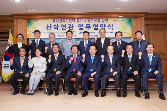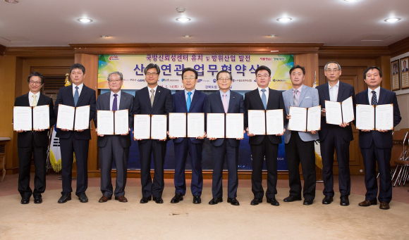 경상북도(도지사 김관용)와 구미시(시장 남유진)는 14일 오후 3시, 도청 제1회의실에서 지역 산학연관 10개 기관․기업체와"국방신뢰성센터 유치 및 방위산업 발전을 위한 업무협약"을 체결했다. * (협약기관) 경상북도, 구미시, 금오공과대학교, 구미전자정보기술원, LIG넥스원(주), 삼성탈레스(주), ㈜일진전자산업, ㈜아원, ㈜지오데코, 중수테크