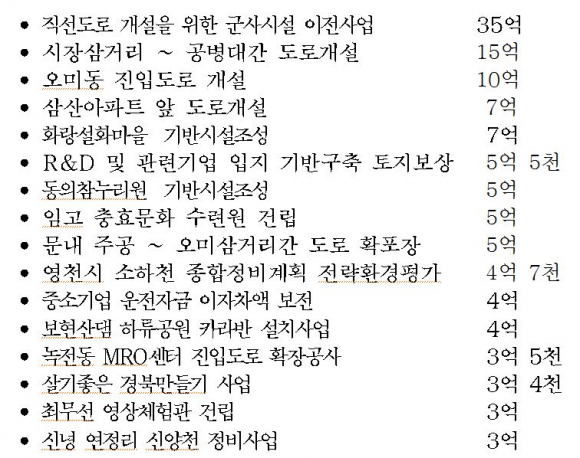 일반회계에 반영된 주요사업으로는 • 직선도로 개설을 위한 군사시설 이전사업 35억 • 시장삼거리 ~ 공병대간 도로개설 15억 • 오미동 진입도로 개설 10억 • 삼산아파트 앞 도로개설 7억 • 화랑설화마을 기반시설조성 7억 • R&D 및 관련기업 입지 기반구축 토지보상 5억 5천 • 동의참누리원 기반시설조성 5억 • 임고 충효문화 수련원 건립 5억 • 문내 주공 ~ 오미삼거리간 도로 확포장 5억 • 영천시 소하천 종합정비계획 전략환경평가 4억 7천 • 중소기업 운전자금 이자차액 보전 4억 • 보현산댐 하류공원 카라반 설치사업 4억 • 녹전동 MRO센터 진입도로 확장공사 3억 5천 • 살기좋은 경북만들기 사업 3억 4천 • 최무선 영상체험관 건립 3억 • 신녕 연정리 신양천 정비사업 3억