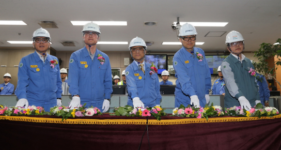 |  | | | ↑↑ 스위칭 세레모니 (우측 세 번째부터 좌측으로 김학동 포항제철소장, 이주형 노경협의회 대표) | | ⓒ GBN 경북방송 | | |