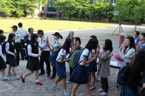 경주경찰서(여성청소년과)에서는 학교전담경찰관(SPO) 4명이 근화여자중·고등학교에서 20일(수) 이른 아침 등굣길 전교생을 대상으로 “허파데이(허그 & 하이파이브 day)” 프로그램을 운영했다.