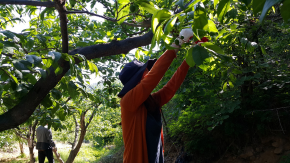 과실솎기 작업을 처음해본 젊은 여직원은 ‘과일이 무조건 많이 달리면 좋은 줄 알았는데 이렇게 솎아주는 작업을 해야한다 것이 흥미로웠다’며 힘들었지만 보람있었다고 하였다.