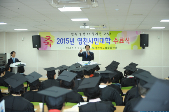 영천시(시장 김영석)는 21일 교육문화센터에서 권호락 시의회 의장, 수료생 등 100여명이 참석한 가운데 2015년 영천시민대학 수료식을 가졌다. 영천시민대학은 시민의 잠재능력 개발과 삶의 질 향상을 위해 영천시가 마련한 평생교육의 장으로 지난 4월 2일부터 2개월 동안 인문학, 건강, 문화, 내 고장 현장학습 등 다양한 주제로 수준 높은 교육을 실시했다. 또한 현대식 건물로 이전해 교육생들에게 최신식 강의실을 제공하는 등 수준을 더욱 높여 큰 호응을 이끌어냈다.