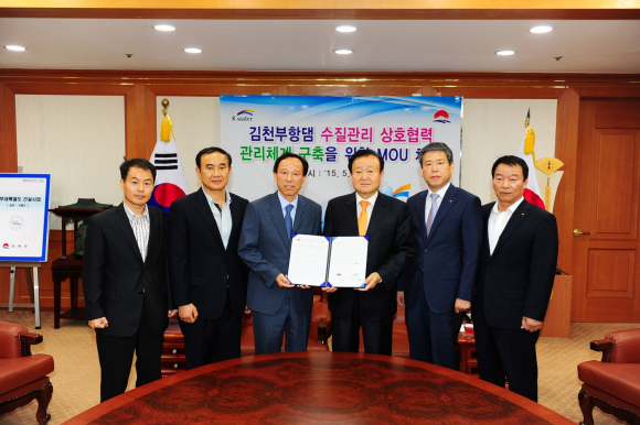 김천시는 ‘15년 5월 26일 김천부항댐 저수지 내 수생태계 공동관리체계 구축을 위해 K-water 김천부항댐관리단과 부유물 수거 및 처리에 관한 협약을 체결했다.