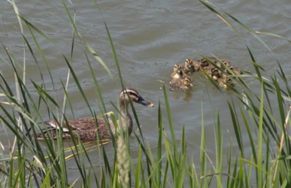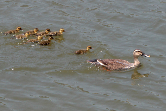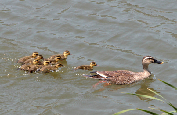 27일 오후 포항시 남구 연일읍 중명리 형산강변에 흰뺨검둥오리 어미와 새끼가 한가로운 한때를 보내고 있다.