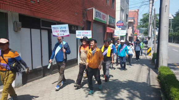 자산동(동장 류장한)은 지난 31일 동 직원들과 체육회(회장 이병철) 회원들 간의 화합과 우호를 증진하기 위한 등반 대회를 추진하면서 시정 최우선 과제인 15만 인구회복을 위한 가두 행진을 전개하였다.