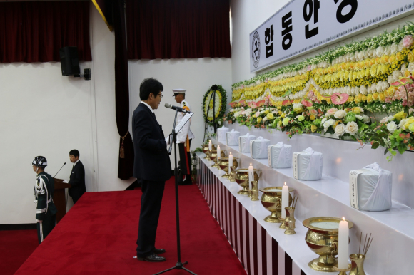 오늘 합동안장식은 호국영령의 숭고한 희생정신을 기리는 최성덕 총재의 조사로 영령을 추모하고 제1해병사단 의장대와 군악대의 연주로 국가유공자의 영현 8위를 봉송하며 엄숙하게 거행되었다.