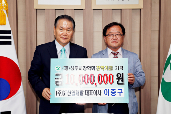 상주시 사벌면 목가리 소재 ㈜ GT산업개발(대표이사 이중구)이 9일 상주시청을 방문해 (재)상주시장학회에 장학금 1,000만원을 기탁했다.