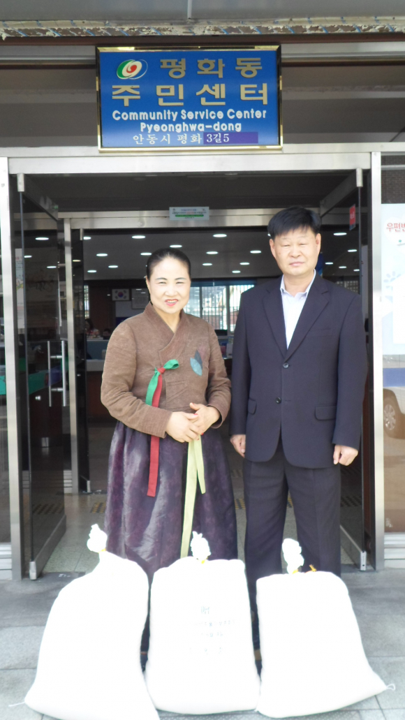 안동제비원성주풀이보존회 송옥순 회장은 지난 6월 9일 평화동 관내 독거노인, 중증장애인, 소년소녀가정 등 일시적으로 생계가 곤란해 어려움을 겪고 있는 가정에 배부하고자 쌀40㎏ 3포(240천원 상당)를 평화동주민센터에 전달했다.