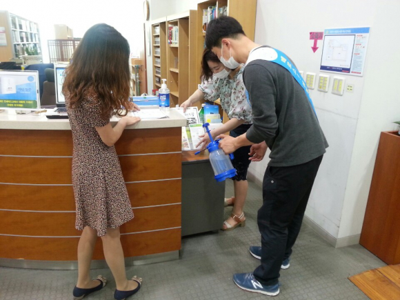 또한, 모든 출입구에는 안내도우미가 배치되어 직접 손 소독제를 분사하고 홍보물과 마스크를 배부하고 있으며, 반납도서는 반드시 책 소독기를 사용해 소독을 하는 등 이용자들의 안전을 위해 최선을 다하고 있다.