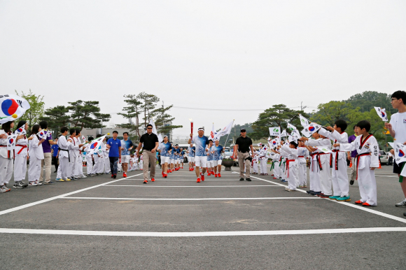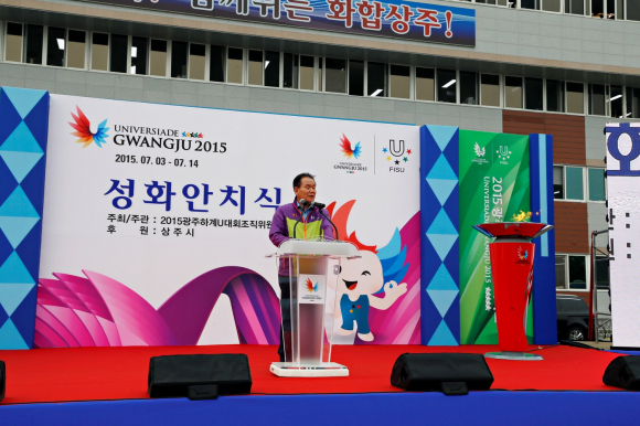 상주시에서는 18일 시청 전정에서 ‘2015 광주하계유니버시아드대회 성화봉송 행사’가 열렸다.