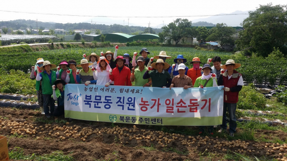 상주시 북문동주민센터는 23일 일손이 부족하여 어려움을 겪고 있던 만산동 김원배(81세)씨 농장에서 남영숙 시의회의장을 비롯한 임부기 시의원, 동주민센터와 시청 공보감사담당관실 직원, 새마을단체 회원 등 20여 명이 참여하여 무더위에도 불구하고 감자 수확에 값진 구슬땀을 흘렸다.
