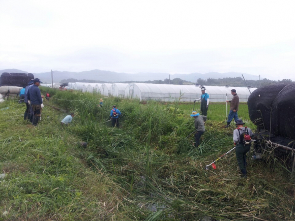 |  | | | ⓒ GBN 경북방송 | | 성주읍 용산1리(이장:김당림)에서는 6월 27일(토) 이른 새벽부터 마을 주민 50여명이 힘을 모아 장마철 대비 배수로 정비를 실시했다. 참외 수확 등 바쁜 농사철에도 불구하고 용산들 중앙 배수로에 무성하게 자란 잡풀 등을 손수 예취기를 들고 제거하고, 배수로 기능을 저해시키는 보온덮개 및 쓰레기를 치우는 등 내 들녘 깨끗이 하기와 배수로 정비를 함께 실시했다.