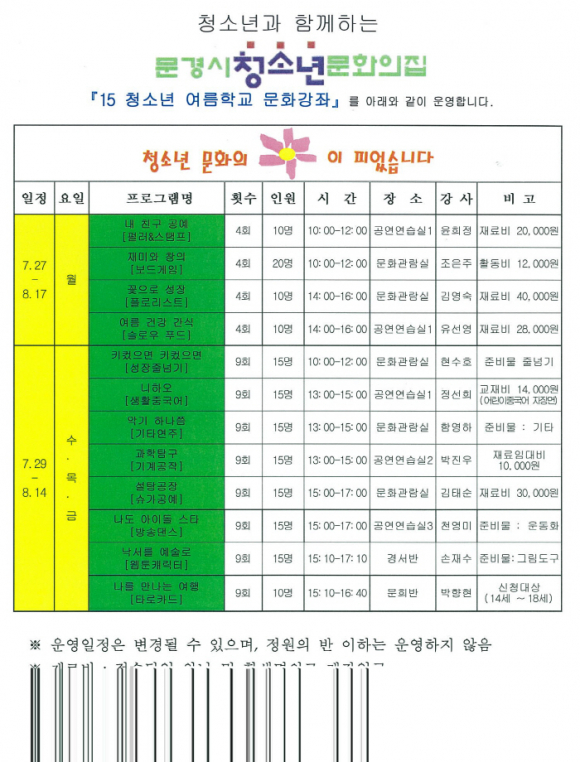|  | | | ⓒ GBN 경북방송 | | 문경시 청소년문화의집에서는 2015년 7월 27일부터 8월 17일까지“청소년 문화의 꽃이 피었습니다”라는 슬로건 아래 청소년들의 즐거운 방학 프로그램을 운영한다.
