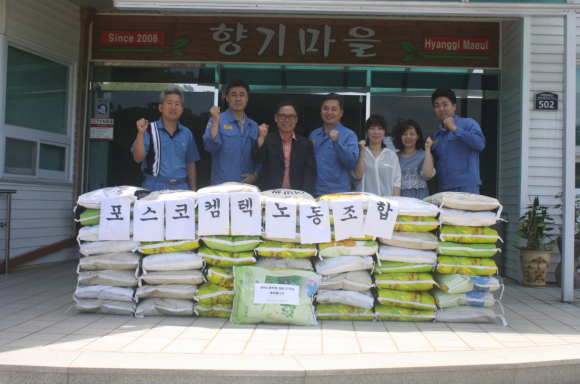포스코캠텍 노동조합(노조위원장 황부성)은 1일 향기마을(원장 장병윤)을 방문해 백미 57포를 기증했다. 포스코캠텍 노동조합에서는 지난해 12월 백미 55포를 기증한 데에 이어 올해도 향기마을을 방문해 백미를 전달하고 담소를 나누는 등 입소자들을 위로하는 시간을 가졌다.