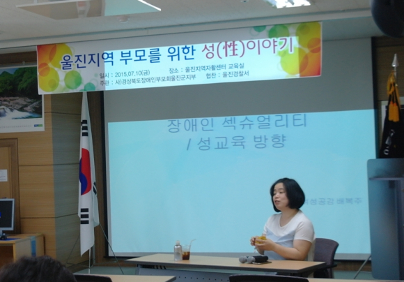 울진장애인부모회(회장 김선미)는 울진경찰서와 지역네트워크를 형성하여 지난 7월 10일(금) 오전10시 ~ 오후12시 까지 총 2시간에 걸쳐 사)장애여성공감 배복주 강사를 초빙하여 장애인부모회원과 울진군민을 대상으로 울진지역자활센터 2층 교육실에서 성교육을 실시하였다.