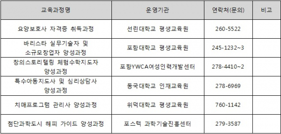 사업은 포스텍을 비롯한 지역대학과 협업을 통해 추진되며, 200여명의 시민들을 대상으로 요양보호사 국가자격증 취득과정 외 5개 평생교육 프로그램을 오는 8월부터 11월까지 운영할 계획이다.