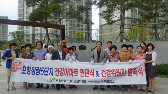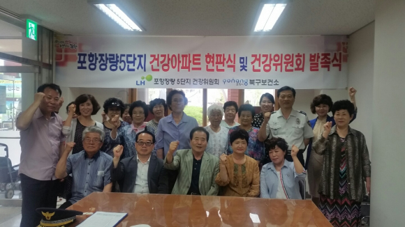 포항시 북구보건소는 23일 올해 신규로 선정된 건강아파트인 포항장량5단지 아파트 회의실에서 주민 및 지역 유관기관 관계자 함께 건강아파트 현판식 및 건강위원회 발족식을 가졌다.