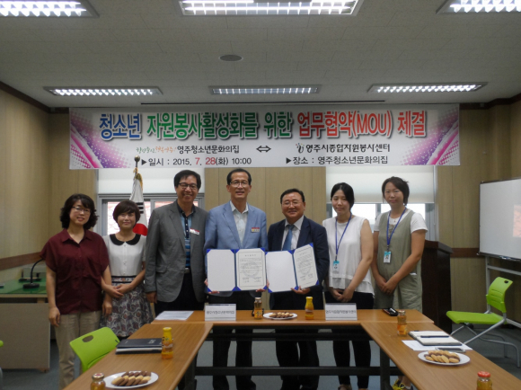 영주시종합자원봉사센터(소장 권영순)는 지난 7월 28일(화) 영주시청소년 문화의집 2층 창작공예실에서 영주시청소년문화의집(과장 우태락)과 자원봉사 업무협약(MOU) 체결을 하였다.