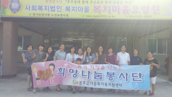 성주군(군수:김항곤) 다문화가족지원센터 희망나눔봉사단은 지난 30일 (목) 푹푹 찌는 오후에 “복지마을 요양원 ”을 방문하여 무더위로 지친 요양원 어르신들을 위해 몸에 좋은 다양한 재료로 맛있는 팥빙수를 만들어 대접하였다.