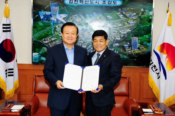 김천시청 2층 접견실에서 박보생 김천시장과 임승환 한국복지사이버대학 부총장은 원격교육과정 수강 학생들에게 한국복지사이버 대학 측이 운영하는 교육서비스를 보다 품질 높은 교육으로 제공하고자 협약을 체결하였다.