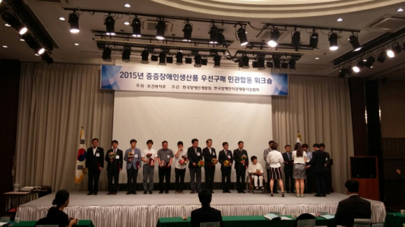 상주시 사벌면에 소재하는 중증장애인생산품 제조업체인 희망세상보호작업장(원장 허만종)에서는 21일 오후 1시 대전 리베라호텔에서 개최된 ‘2015년 증증장애인생산품 우선구매 민관합동 워크숍’에서 우선구매 활성화 유공 우수기관으로 보건복지부장관 표창을 받았다.
