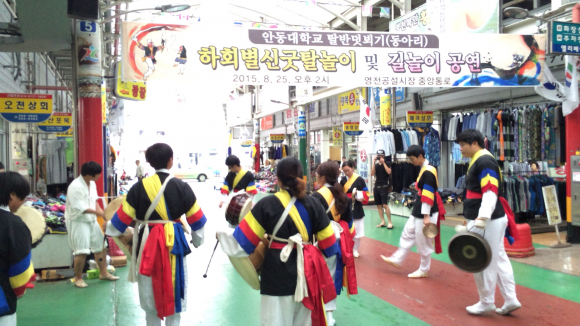 영천시(시장 김영석)는 지난 25일부터 영천공설시장에서 상인회 주관으로 시장을 찾는 고객, 상인 및 지역 주민이 함께 하는 문화공연을 개최하고 있다. 25일에는 안동대학교 탈반덧뵈기팀을 초청하여 신명나는 하회별신굿탈놀이 및 길놀이 공연으로 고객과 상인이 다 같이 어울릴 수 있는 한마당 행사를 개최했다. 제품 구매하는 고객들은 하나같이 어깨를 들썩이며 흥겨운 한마당에 동참하였고 좋은 호응을 보였다.