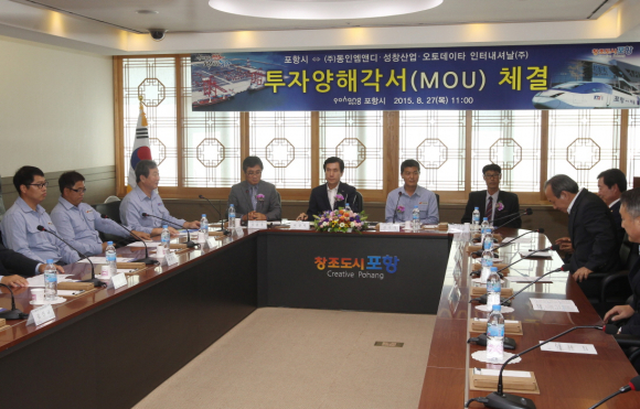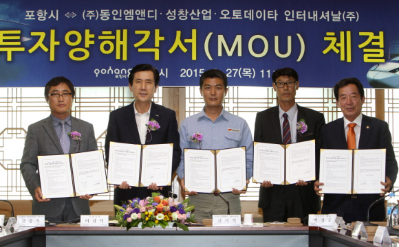 포항시는 27일 이강덕 시장과 기업체 대표 및 임직원이 참석한 가운데 ㈜동인엠앤디, 성창산업, 오토데이타인터내셔날(주) 등 3개 회사와 투자양해각서(MOU)를 체결했다.