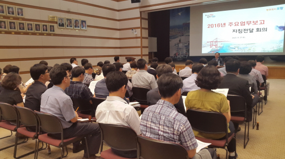 포항시는 27일 시청 대회의실에서 본청, 사업소, 구청 행정담당 등 60여명이 참석한 가운에 ‘2016년 주요업무보고’ 작성지침 전달회의를 개최했다.