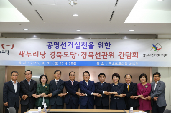 새누리당 경북도당 윤리위원회(위원장 김종태 국회의원, 부위원장 박선하 경북도당 부위원장, 위원 홍해숙 경북대 교수, 최미희 영진전문대 교수, 김인석 변호사)는 금일 8.31(월), 14시 엑스코 소회의실에서 경북 선관위(상임위원 손재권, 사무처장 고충렬)와의 간담회를 진행하고 내년에 치러질 20대 총선에서 깨끗하고 공정한 선거문화 정착을 위해 노력하기로 했다.