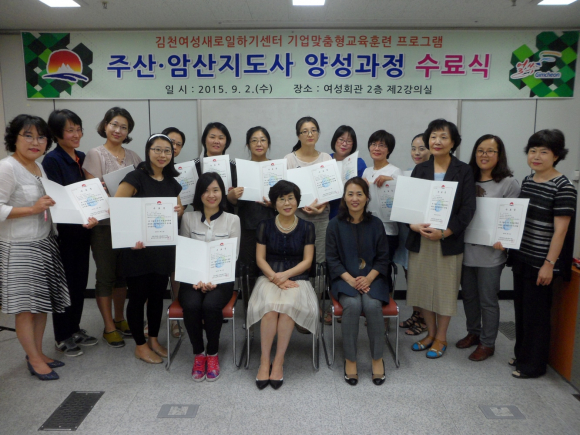김천시 종합사회복지관내 여성새로일하기센터에서는 2015. 9. 2(수) 11:00 여성회관에서 “주산‧암산지도사 양성과정” 수료식을 개최하였다.